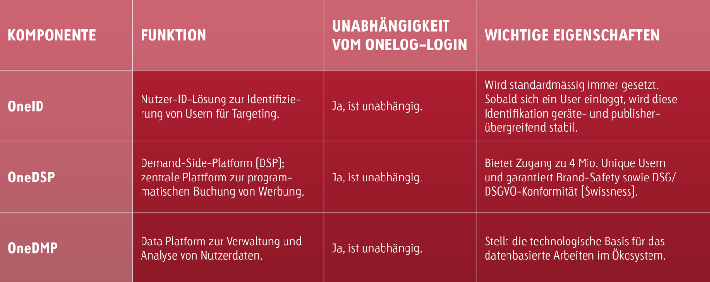 Wichtig zu wissen: Nach dem Hackerangriff auf OneLog wurde das gemeinsame Login-Projekt der Schweizer Medienallianz eingestellt. Die gute Nachricht: OneDSP ist technologisch vollständig vom Login entkoppelt und funktioniert 100% unabhängig. Deine Kampagnen profitieren also weiterhin von geballter Schweizer Reichweite, Datentiefe und höchster Brand Safety.